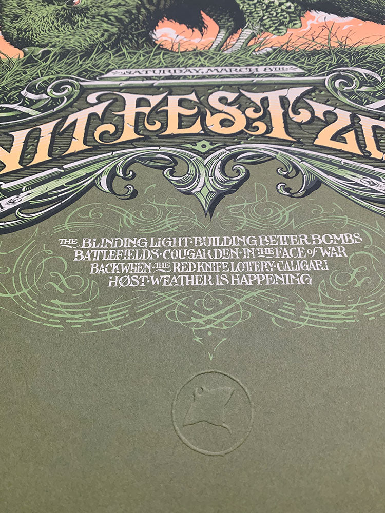 20 x 19” Screenprinted on French Speckletone Olive paper Signed, numbered, and embossed Printer's Proof # 11/12 There is a minor ding on the bottom left corner