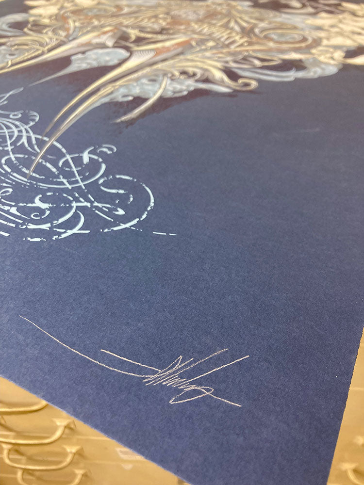 8 color screenprint including metallic bronze ink on off-white paper.