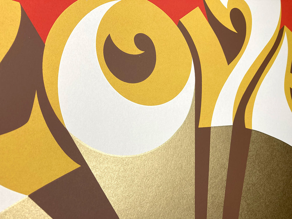 6 color screenprint w/ metallic gold on French Red Hot paper