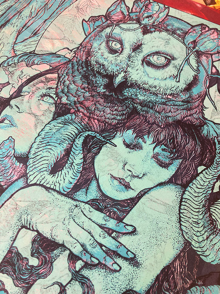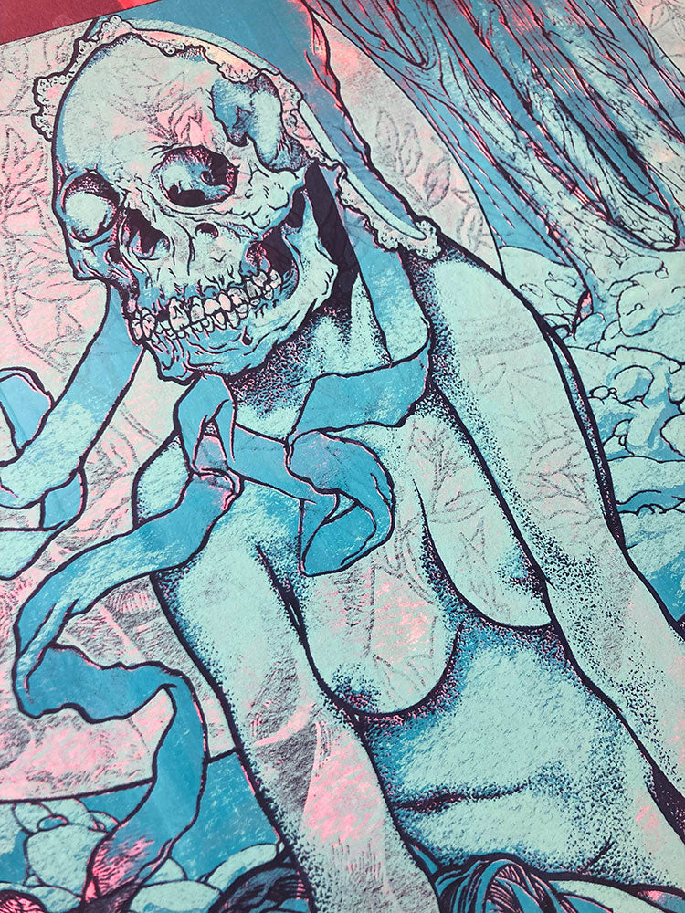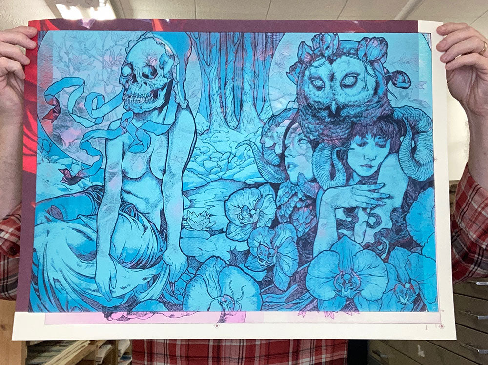 One-of-a-kind test print featuring layers from John Baizley's Kvelertak "Stranglehold" monochrome print and more