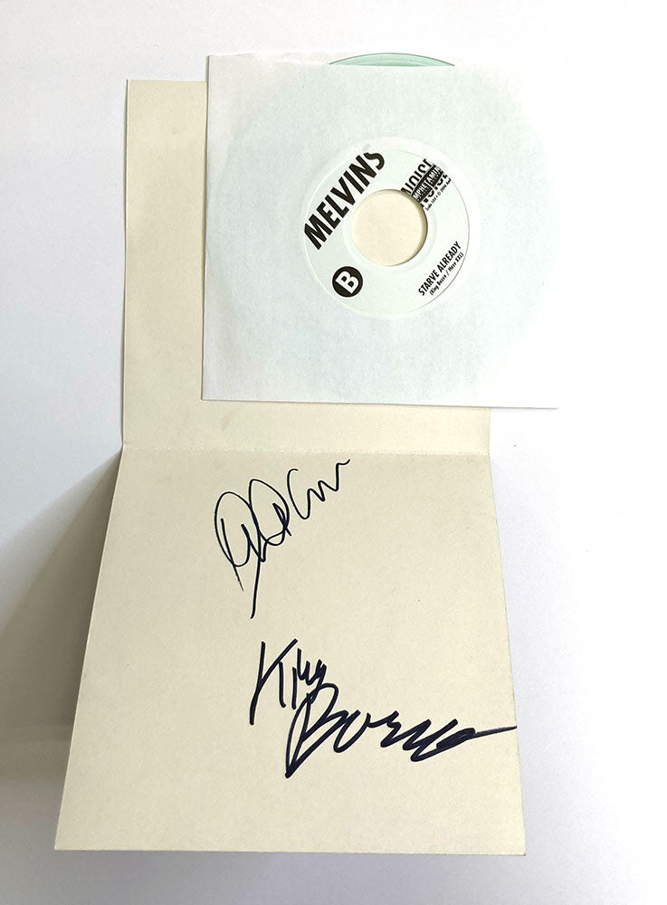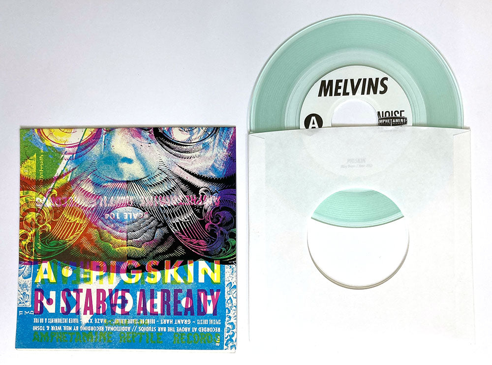 Colorway #1 of Melvins' "Pigskin" / "Starve Already" 7" release on Amphetamine Reptile Records. Transparent mint green vinyl. Inner sleeve autographed by guitarist / vocalist King Buzzo and drummer Dale Crover!