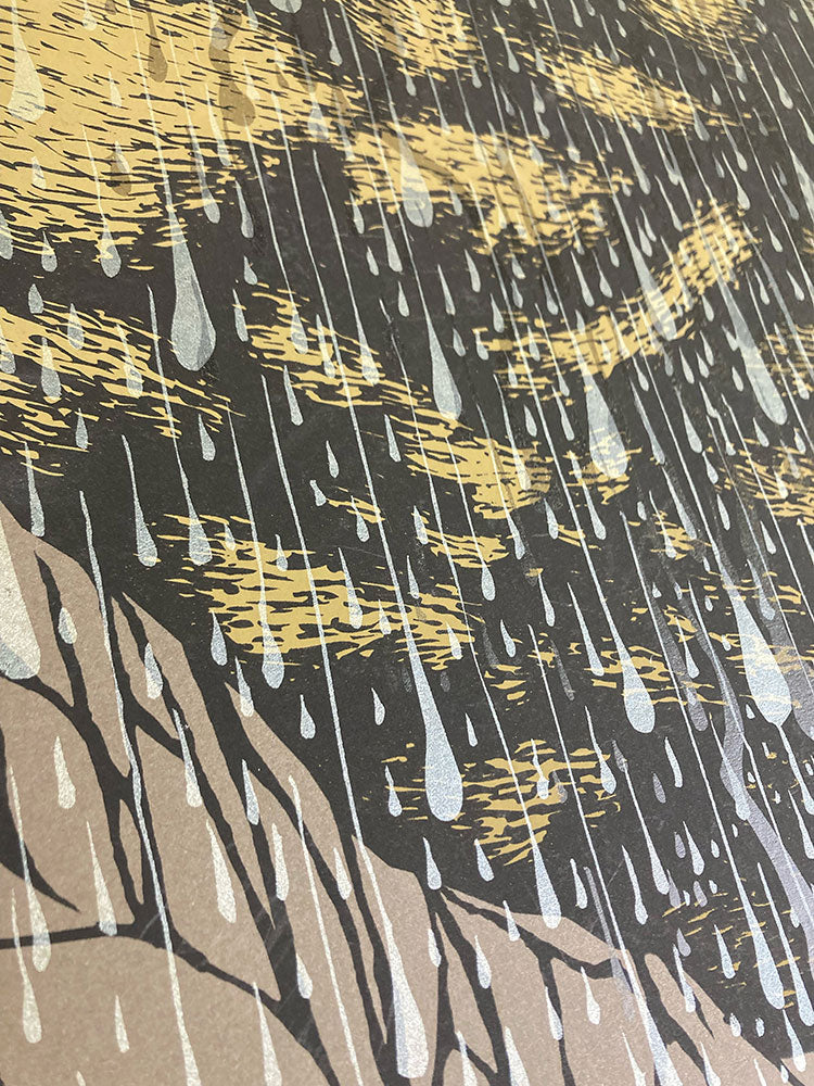 A nice and hard to find print designed by Seldon Hunt and our very own Wes Winship. The transparent / UV gloss / metallic inks give this one a distinct, shimmering rain-like effect.