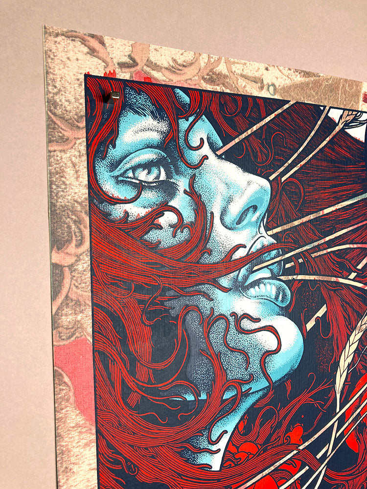 One-of-a-kind test print featuring John Baizley's "Persephone" art print with other layers in the background. Also included are two mini prints from the same print run.