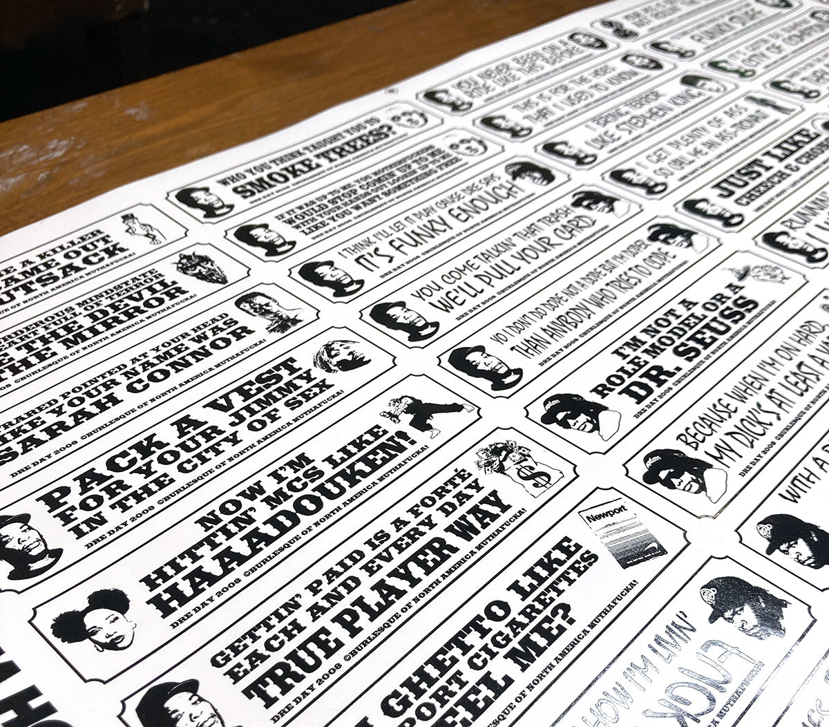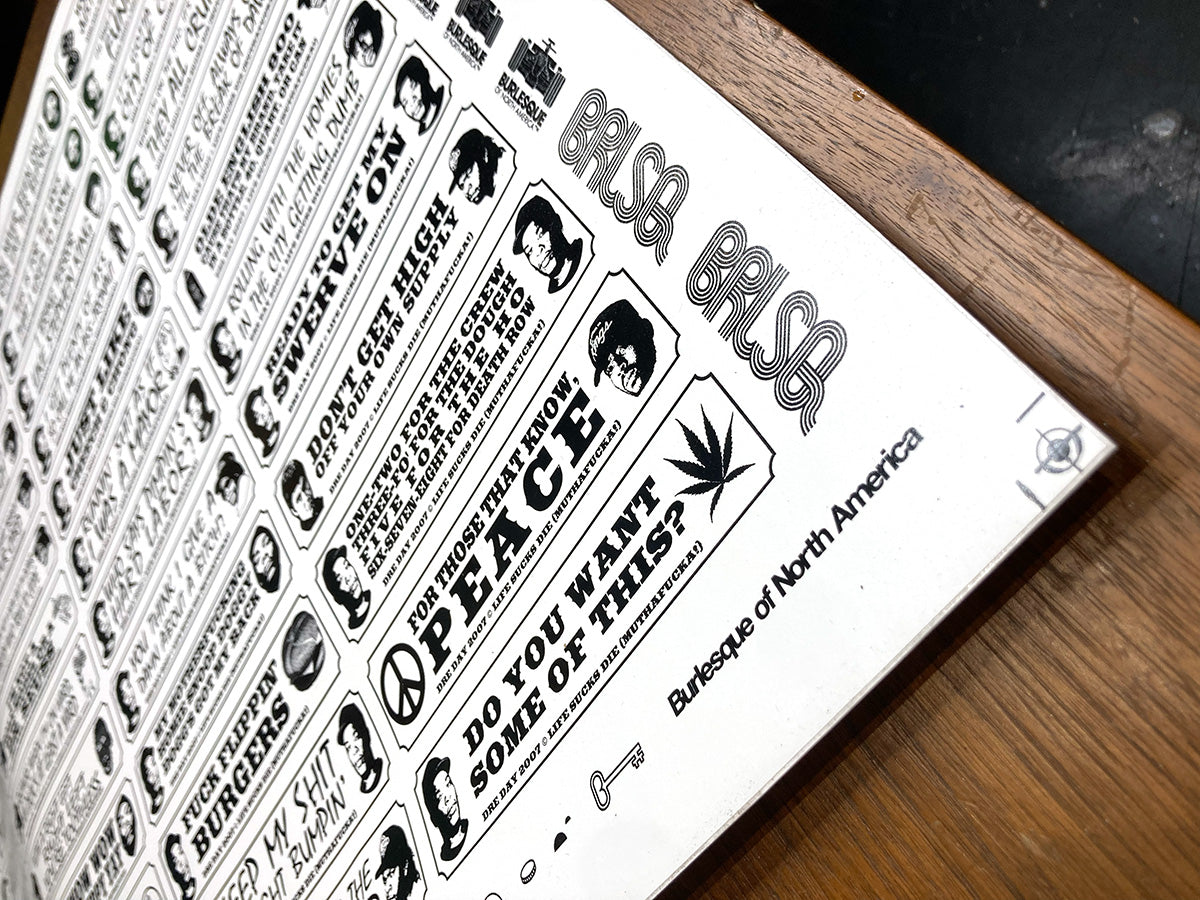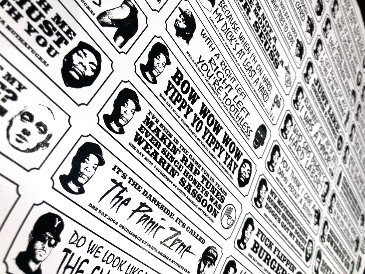 We've been designing and printing stickers to celebrate Dre Day since 2003. With hundreds of different Dre quotes and tens of thousands of stickers out in the world, many of you are more than familiar with the stickers. BUT here's something we don't let out in the open too often: an uncut sheet of stickers from the 2007 and 2008 series. All 48 stickers from the two packs are set up side-by-side, surrounded by smaller Burlesque promo stickers, and capped off with our printing registration marks, printed in shiny UV black ink on an adhesive white sticker sheet.
