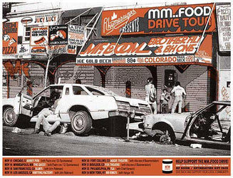 We were thrilled to the gills to have the chance to design MF DOOM's album release tour poster. Our original top secret idea didn't work out, but rest assured we'll come through with it soon enough, and heads will cold get flown, yaoming? But here is the tour poster which DID happen, a typical street scene in Brooklyn, NY, circa 1982, with DOOM's bodega hopping as usual. Stop in for specialty food items from each featured city along the tour, including Minneapolis' Jucy Lucy. You can't tell in the JPG, but the giant DOOM graf is printed in metallic silver ink.